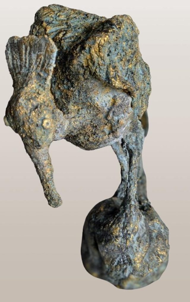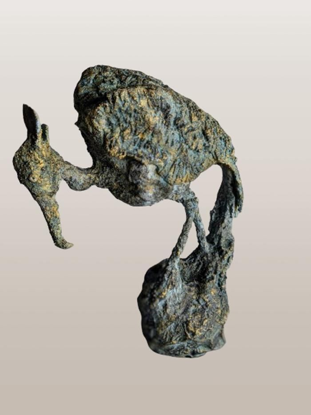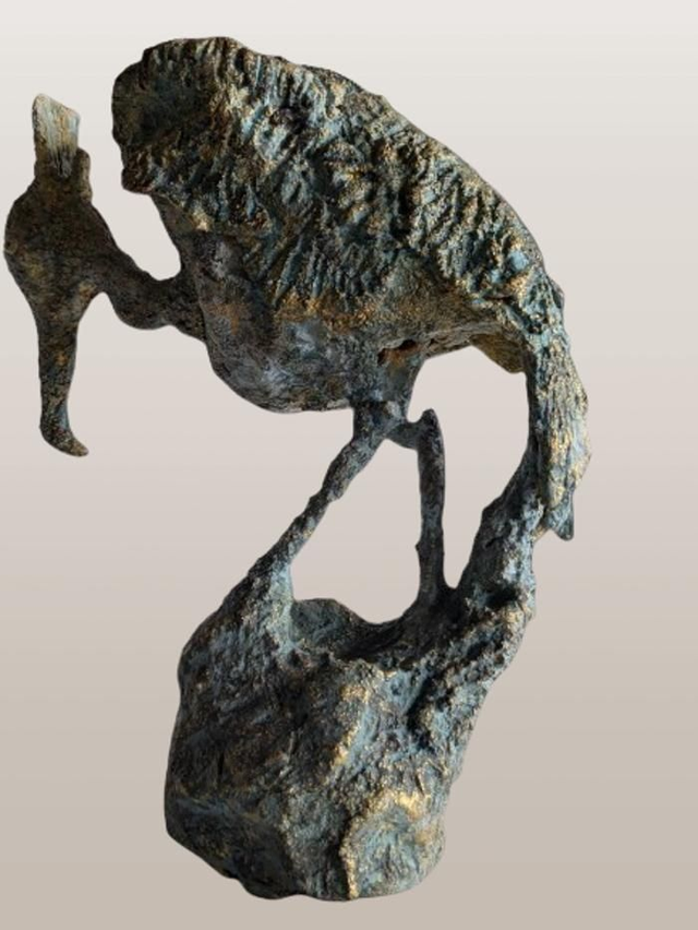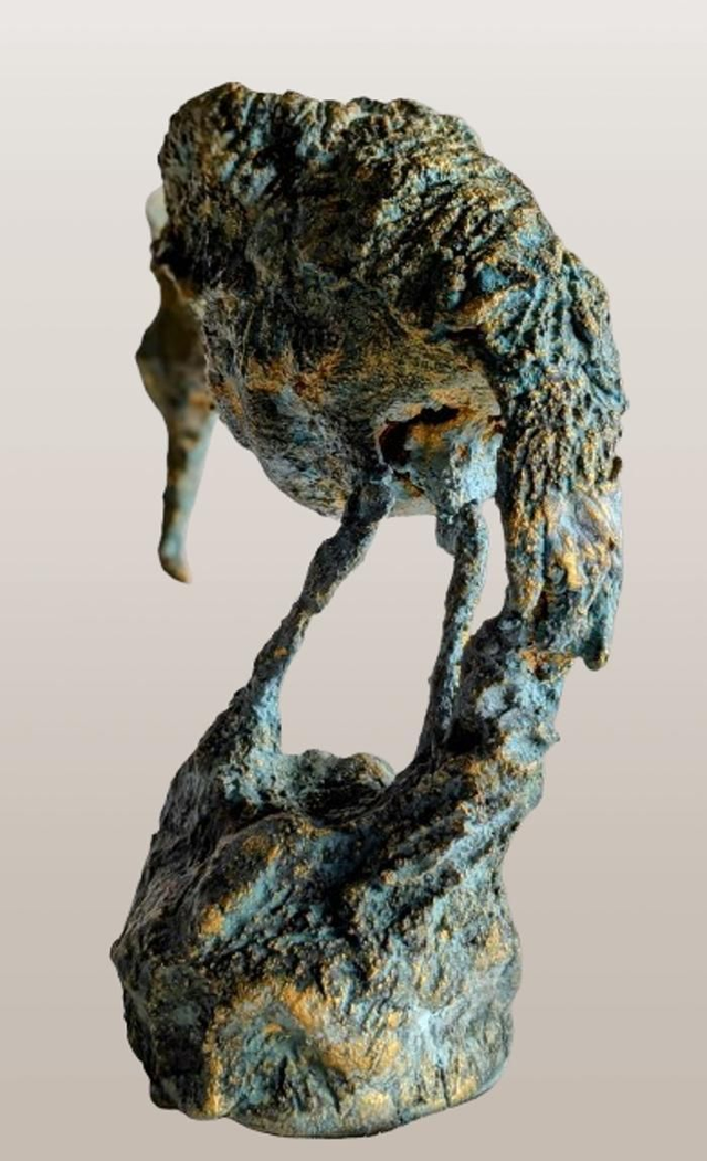 Sculpture oiseau fantastique en fer et terre cuite patinée bleue aux reflets dorés. Sculpture figurative contemporaine.